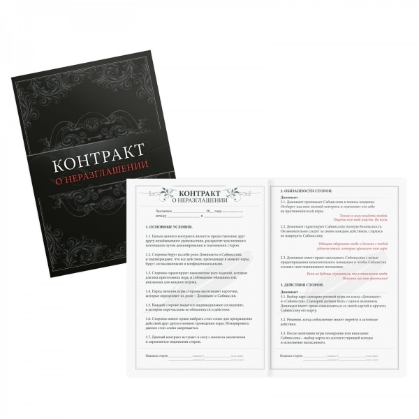 Откройтесь новым ощущениям! Один безумный шаг изменит отношения и превратит их в подборку горячих фильмов для взрослых. Билеты в эротический мир уже в ваших руках, остается заключить контракт и выбрать сценарий. Используйте БДСМ-практики и аксессуары вместе с эротическими играми «50 оттенков страсти», чтобы испытать желанные ощущения и узнать о новых источниках удовольствия! Как пользоваться набором? Распределите роли и подпишите контракт о неразглашении. Все, что произойдет во время игры, должно сохраниться в секрете. Также в комплекте есть карты с ролевыми играми. Выберите конкретную или доверьтесь случайности, разыграв любой сценарий. Доминант вправе наказать или поощрить сабмиссива во время сексуальных игр. Для этого он вытягивает карту наказания или поощрения и приказывает исполнить написанное. Внутри: • 2 контракта, • 2 карты ролей (6х9 см), • 14 карт поощрения (6х9 см), • 14 карт наказания (6х9 см), • 20 карт ролевых игр (6х9 см), • анальный стимулятор (6,7х2,8 см), • зажимы для сосков, • эрекционное кольцо.